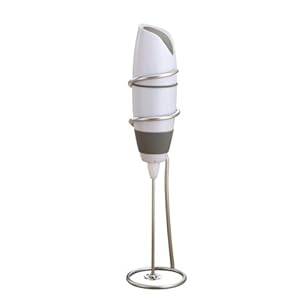 In just seconds, Bonjour's automatic frothers produce rich creamy froth for your favorite coffee drinks. This battery operated frother whips milk into thick foam in seconds for creating a latte, cappuccino or macchiato. It's also handy for sauces, hot chocolate, foamy cocktails and even scrambles eggs. The soft-touch push button and chrome stand make this easy to use and store. White with gray trim and push button, powered by 4 AA batteries.